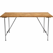 Lyst rustikt spisebord med bordplate laget av resirkulert tre. Bordplaten er sandblåst for å jevne ut ujevnhetene som naturlig oppstår i slikt resirkulert tre. I tillegg hjelper det også med å lysne opp bordplaten når topplaget slipes bort. Den sammenleggbare jernfoten gir bordet et lett og enkelt utseende og bordet tar ikke mye plass når det er sammenslått.