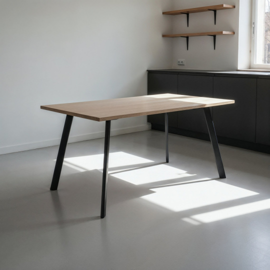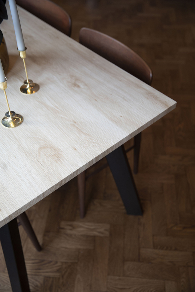 Det lyse treet i bordplaten gir en frisk og naturlig følelse som passer perfekt til skandinavisk interiør, mens de svarte metallbenene gir en industriell touch som balanserer det minimalistiske uttrykket. Dette matbordet er den perfekte blandingen av stil og funksjonalitet, ideelt for både hverdags- og festmåltider!