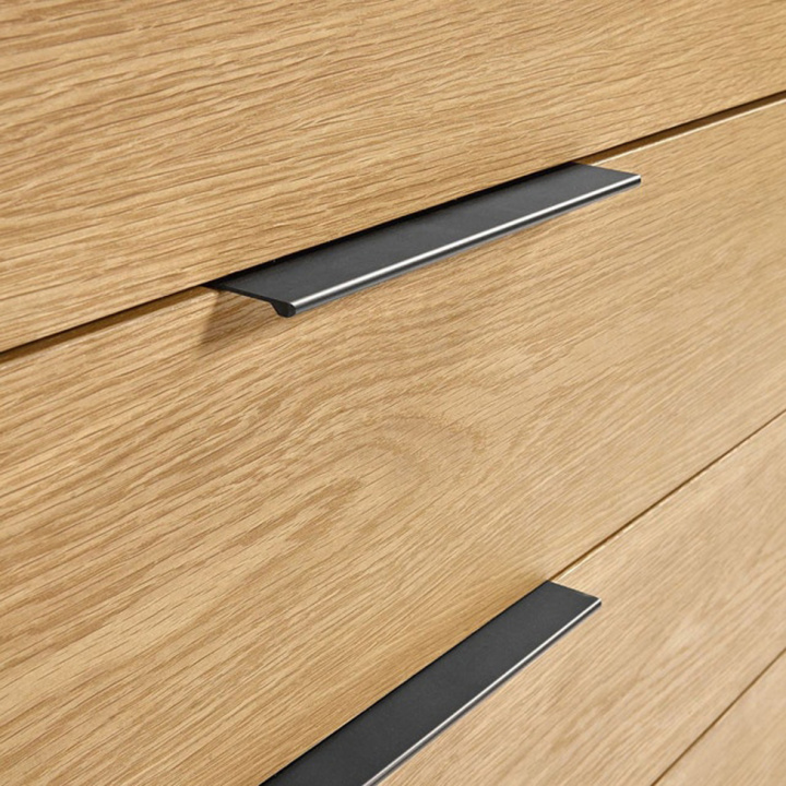 | Materiale: | Ramme i sort MDF. Skuffefronter i MDF. Ben og håndtak dukket opp i svart metall. |