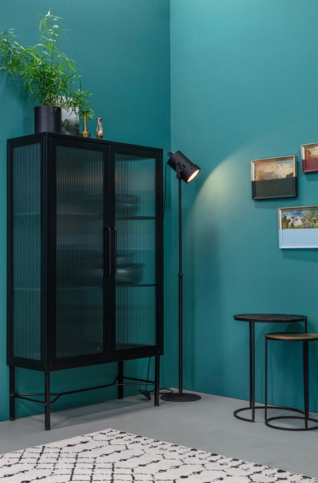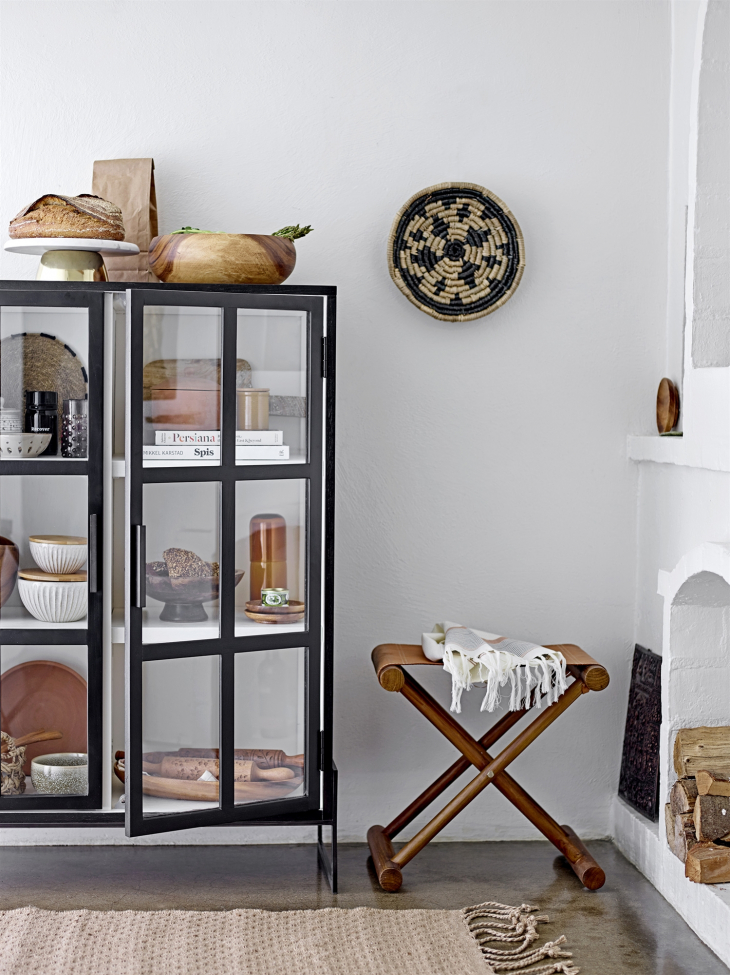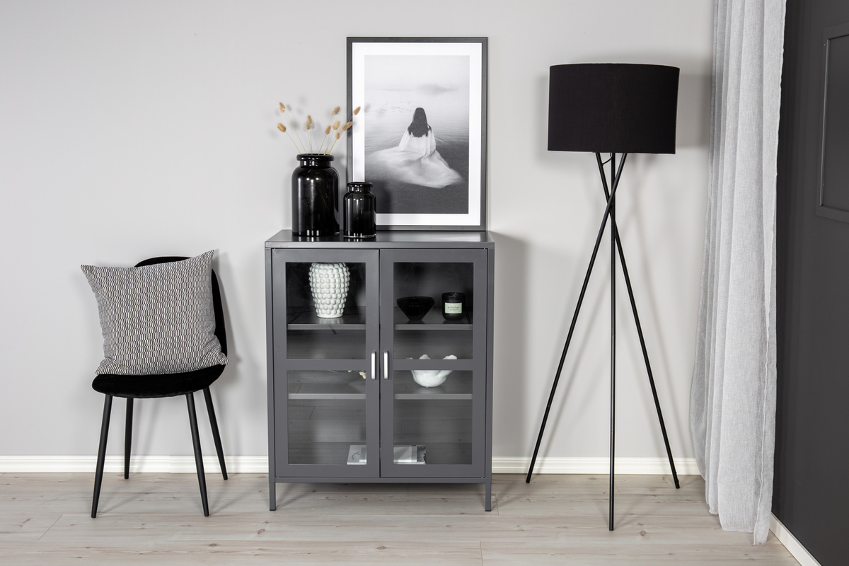 Velg skap og skjenker som kompletterer dine øvrige møbler i stil og farge. Et vitrineskap i svart metall gir en industriell følelse, mens et rottingskap gir et mer bohemsk og lett uttrykk. Tenk også på proporsjonene i rommet – små rom har ofte godt av smale og høye møbler.