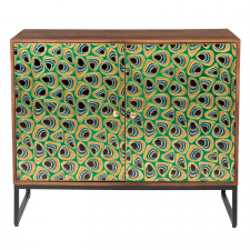 Stilig og moderne skap som er en drøm å ha hjemme. Skapdørene er mønstret og i flere flotte farger. Skapet er også praktisk hvis du trenger et sted å lagre tingene dine eller klærne dine. Fin rektangulær form med brun topplate og sorte skapben. Hvis du vil skape kontraster i et ellers nøytralt hjem, er dette noe for deg, eller for deg som liker forskjellige og fargerike møbler i alle former.