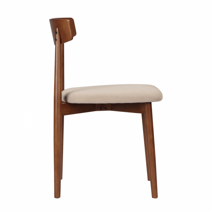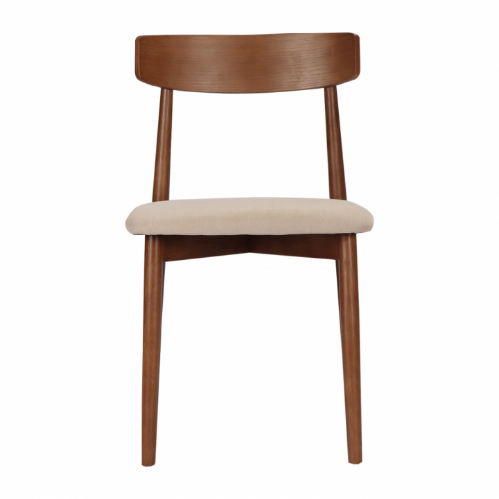 Denne elegante og klassiske stolen er laget av naturlig valnøttfarget eik, som gir den en holdbar og tidløs følelse. Stolen har et stilrent ryggstøtte med en finish av slitesterk MDF på baksiden, som gir både stabilitet og et pent, moderne utseende. Setet er trukket i et mykt beige stoff som ikke bare er behagelig, men også lett å matche med ulike interiørstiler – perfekt for både spisestuen og stuen.